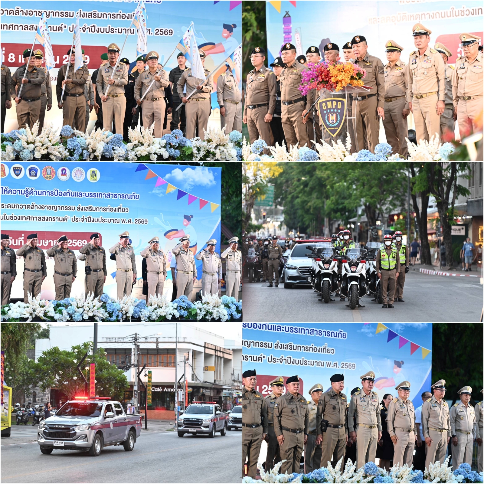วันที่ 8 เม.ย 69 ลานอนุสาวรีย์สามกษัตริย์ จังหวัดเชียงใหม่ พลตำรวจโท กฤตธาพล ยี่สาคร ผู้บัญชาการตำรวจภูธรภาค 5 เป็นประธานปล่อยแถวระดมกวาดล้างอาชญากรรม พร้อมยกระดับมาตรการดูแลความปลอดภัยในช่วงเทศกาลสงกรานต์ ปี 2569 โดยมี นายรัฐพล นราดิศร ผู้ว่าราชการจังหวัดเชียงใหม่ นายชัชวาลย์ ปัญญา รองผู้ว่าราชการจังหวัดเชียงใหม่ ส่วนราชการ หน่วยงานที่เกี่ยวข้อง ร่วมกันปล่อยแถวระดมกวาดล้าง ซึ่งเป็นการบูรณาการกำลังจากตำรวจภูธรจังหวัดเชียงใหม่และหน่วยงานที่เกี่ยวข้อง รวมกำลังทั้งสิ้น 635 นาย ซึ่งจะกระจายลงพื้นที่สำคัญและแหล่งท่องเที่ยวทั่วจังหวัด