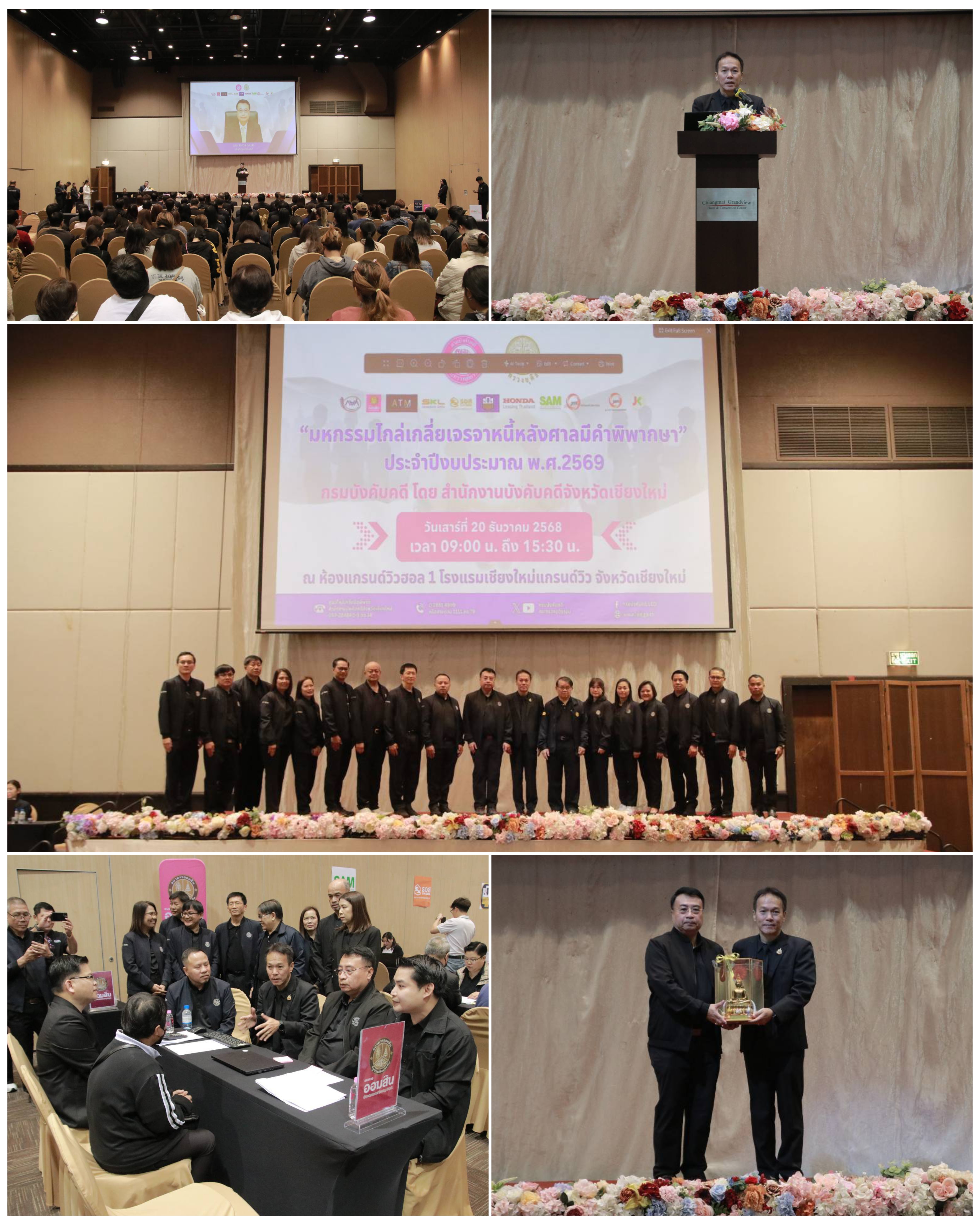 วันที่ 20 ธ.ค. 68 ที่ โรงแรมเชียงใหม่แกรนด์วิว จังหวัดเชียงใหม่ นายเสกสรร สุขแสง อธิบดีกรมบังคับคดี เป็นประธานในพิธีเปิดงาน “มหกรรมไกล่เกลี่ยเจรจาหนี้หลังศาลมีคำพิพากษา จังหวัดเชียงใหม่” ประจำปี 2568 โดยมี นายศิวะ ธมิกานนท์ รองผู้ว่าราชการจังหวัดเชียงใหม่ พร้อมด้วย นายอรรถโกวิท ชาวเหนือ ผู้อำนวยการสำนักงานบังคับคดีจังหวัดเชียงใหม่ หัวหน้าส่วนราชการ หน่วยงานภาครัฐ ภาคเอกชน และประชาชนเข้าร่วมพิธี